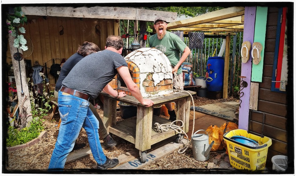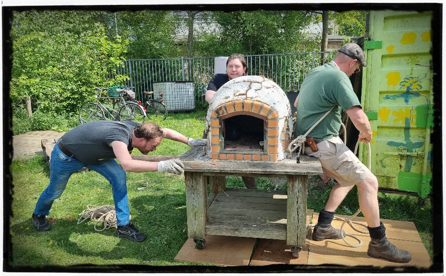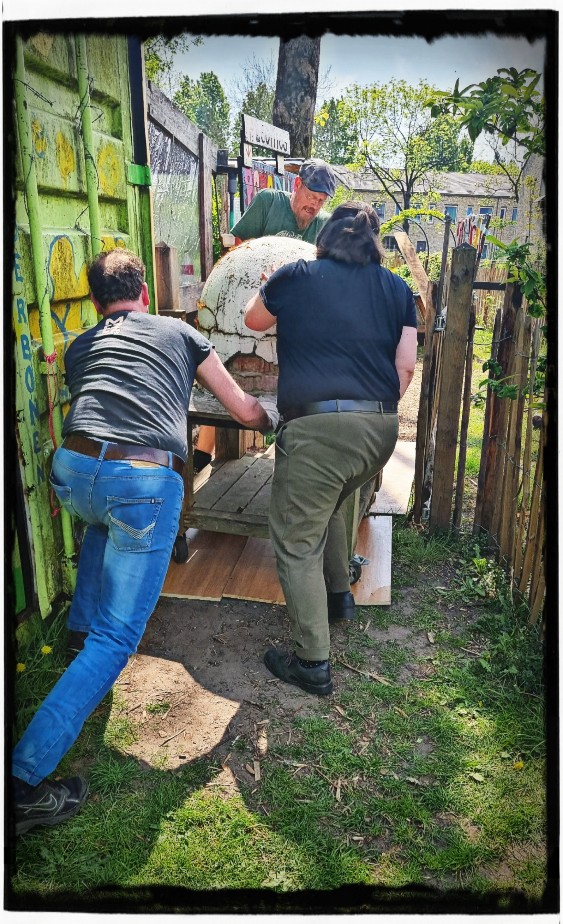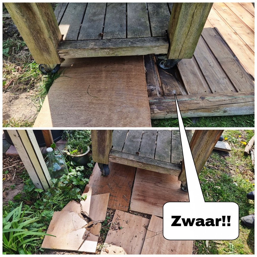 Daarna kwam Chantal Stekker de container dakpannen fixen. Want die waren prongeluk losgekomen. Ze gaat er later nog mee aan de slag. Maar ze zitten nu even vast met een spanbandje.