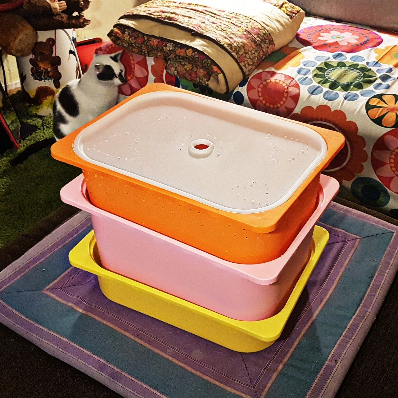 In de eerste bak vang je straks het overtollige vocht op. Door twee potjes erin te zetten “vergroot” je de ruimte.
