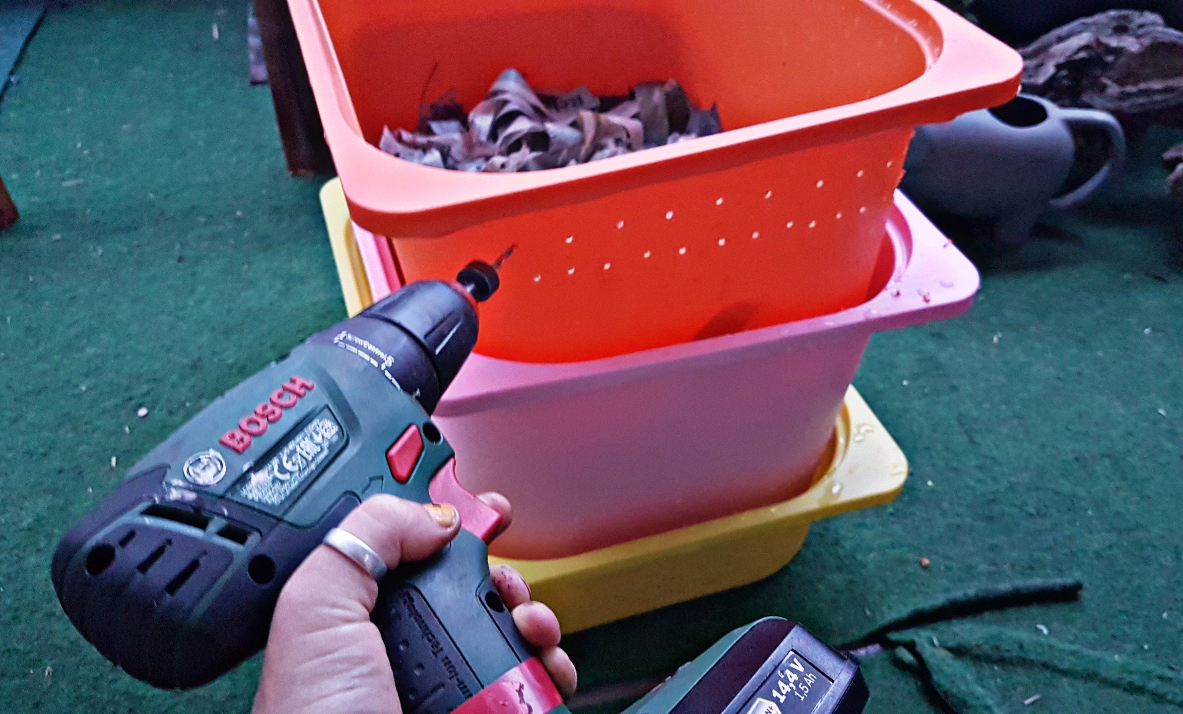 In de bakken erna boor je gaatjes van 6 mm. Hier kunnen de wormen straks van de ene naar de andere bak kruipen.