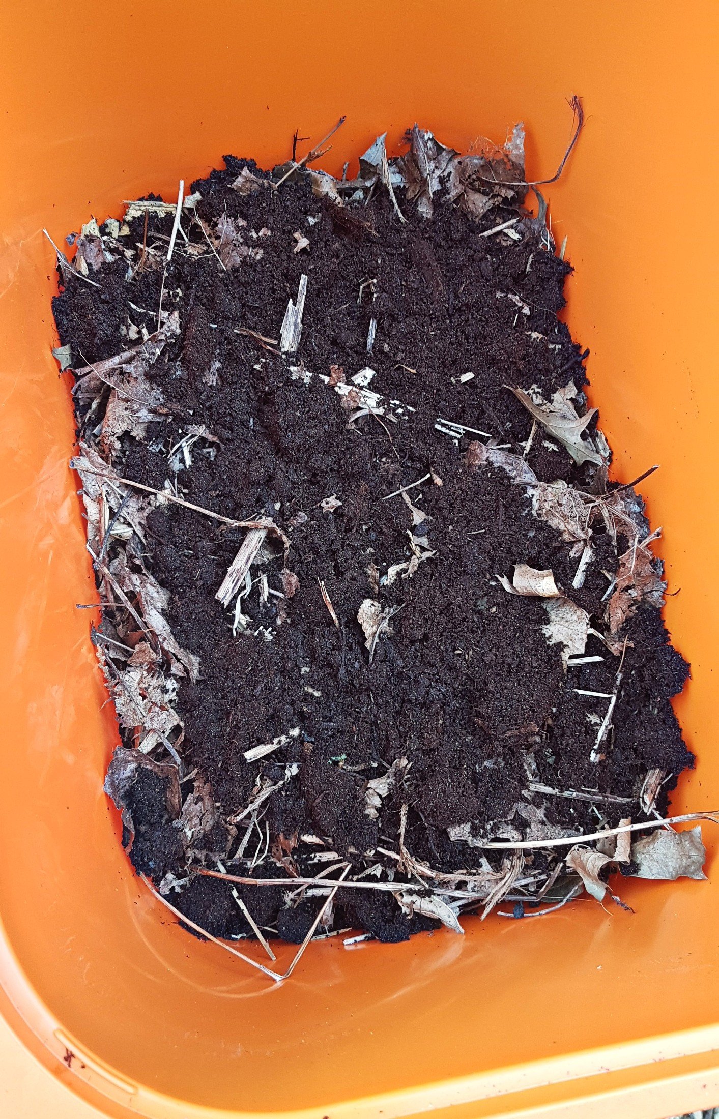 Doe er een laag groenafval en koffiedik bij. Vermijd vlees, vis, citrusvruchten, ui en knoflook en deegwaren.