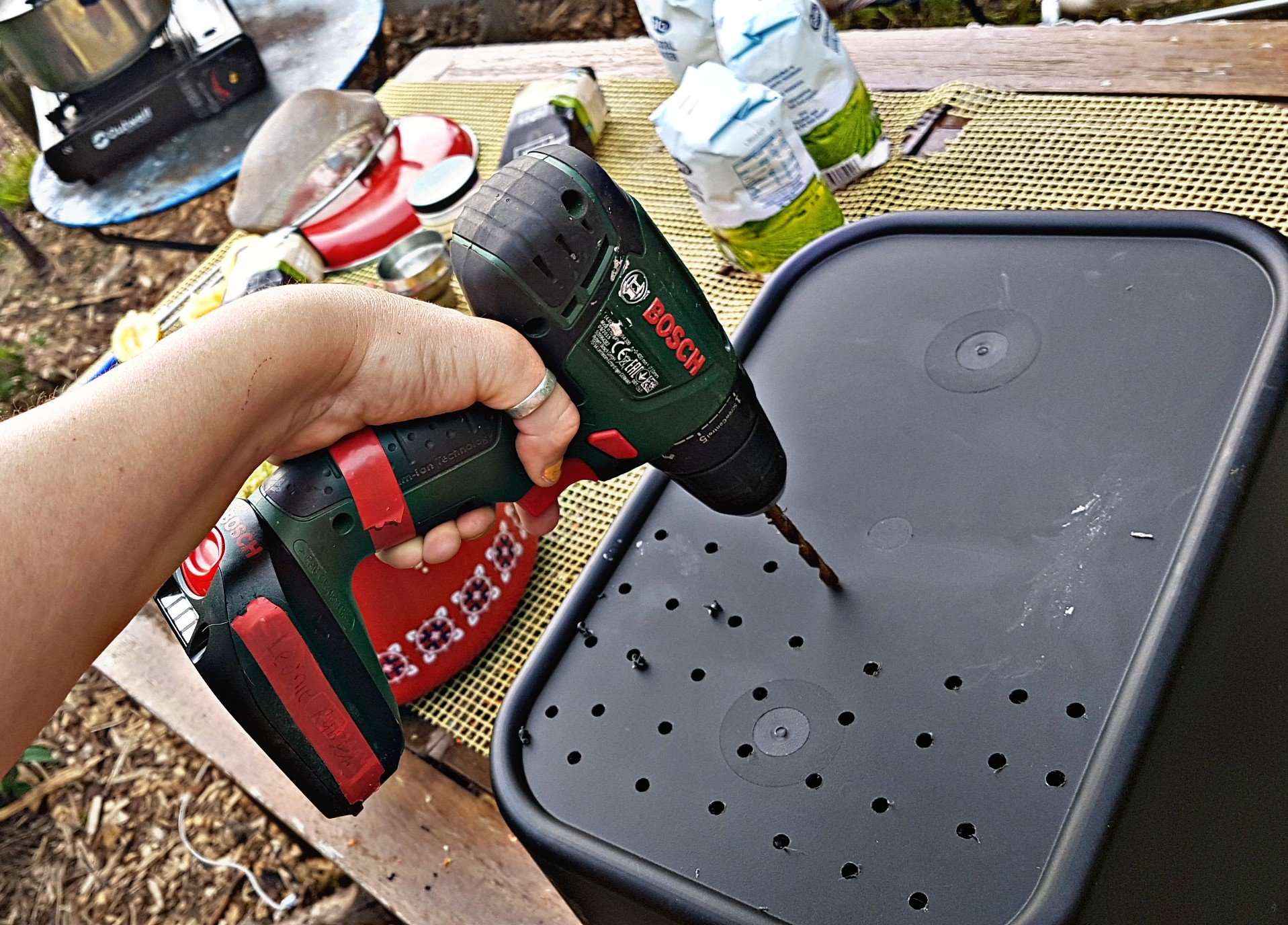 Nog wat gaatjes van 2 mm in de zijkant van de bak voor ventilatie.